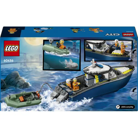Izveicīgs nelietis superātrā laivā traucas prom no LEGO® City ostas ar nozagtu rubīnu. Ienirsti piedzīvojumos ar policijas laivu kopā ar policistiem! Šai jaudīgajai laivai ir viss, kas nepieciešams, lai notvertu blēžus, tostarp divi ārējie dzinēji un iekšējā kamera. Izvairies no izsalkušās haizivs un traucies pa viļņiem, lai glābtu situāciju. Pakaļdzīšanās rit pilnā sparā LEGO City pilsētā!