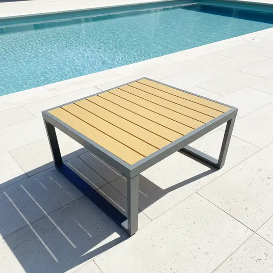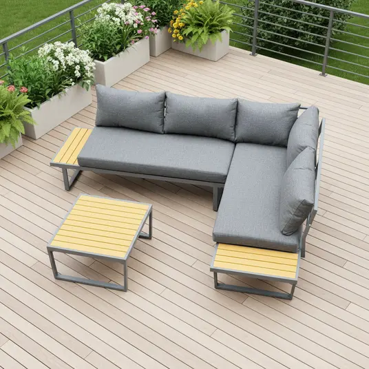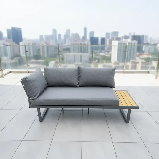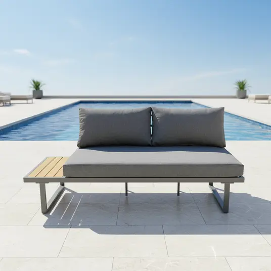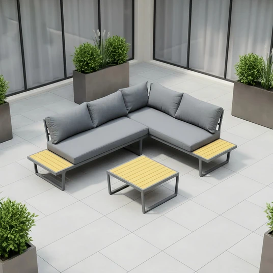 Visu detaļu konstrukcija ir izgatavota no alumīnija un pārklāta ar pelēku pulverkrāsu, kas nodrošina izturību pret laikapstākļu ietekmi. Galda virsmas izgatavotas no Polywood materiāla, kas ir izturīgs un viegli kopjams. Spilvenu audums ir Olefin – mitrumizturīgs un UV noturīgs, pildījums – šķiedra. Sēdvietas porolona biezums ir 10 cm, nodrošinot augstu komfortu. Komplektā ietilpst 2 sēdvietu spilveni (140 × 70 × 10 cm) un 5 atzveltnes spilveni (73 × 50 × 10 cm un 50 × 50 × 10 cm). Spilveni iepakoti atsevišķi.
