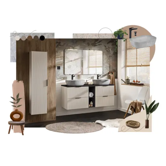 Składowe setawu uz: szafka pod umywalkę ADEL CASHMERE 82-80-2S, blat UN. 89-80-B WOTAN vai ADEL KAŠMIRA 80-01-1D izšuvums. Katra no šīm daļām ir ne tikai funkcionāla, bet arī stilīga, kas padara komplektu par ideālu papildinājumu jebkurai vannas istabai.