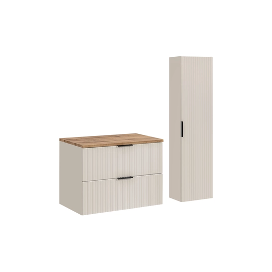 Meblowy komplekts ir 80 cm plats un 46 cm dziļš, un tas lieliski iederas katrā mājā neatkarīgi no tā izmēra. Kolor kaszmirowy mat w kombinati z Dębem wotan nadka meblom elegansego zażku kwóry za sządę będzie ozdobą čeżnej bazinądzi.