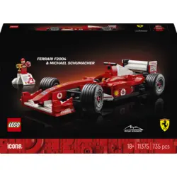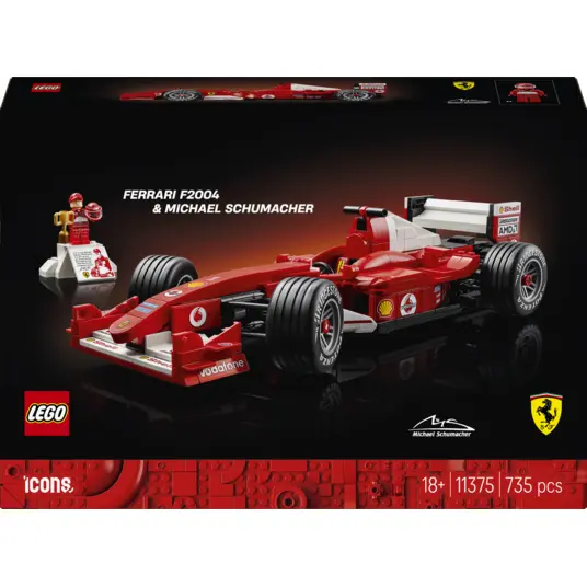 Cildini Formula 1 zelta laikmetu ar LEGO® Icons Ferrari F2004 un Michael Schumacher (11375) auto modelīša komplektu. Uzbūvē mērogotu leģendārā auto modeli, kas kopā ar Mihaelu Šūmaheru dominēja 2004. gada sacīkšu sezonā. Ferrari modelītim ir funkcionāls stūrēšanas mehānisms, rievotas riepas un detalizēts V10 dzinējs, kā arī demonstrēšanas statīvs ar informāciju par transportlīdzekli un statistiku. Mihaela Šūmahera minifigūrai ir ķivere, uzvarētāja trofeja un stends paaugstinājuma stilā, uz kura ir uzdrukāts attēls un septiņkārtējā pasaules čempiona citāts.