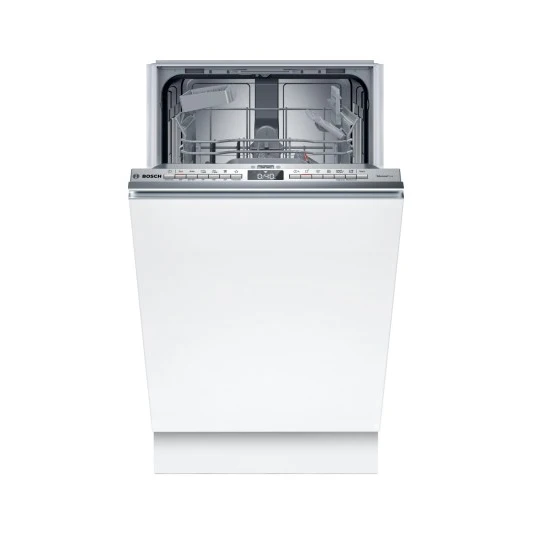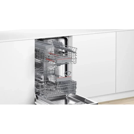 The Bosch SPH4EKX17E Fully Integrated Dishwasher offers a seamless and efficient solution to modern dishwashing needs, fitting discreetly into your kitchen with its fully integrated design. This sleek dishwasher is tailored to accommodate up to 10 place settings, making it ideal for smaller households or kitchens with limited space. Engineered by Bosch, a leader in home appliances, the SPH4EKX17E is designed to deliver powerful cleaning performance while maintaining energy efficiency. It comes equipped with a variety of wash programs and settings, allowing users to customize cycles based on the type and degree of soiling of their dishes. The dishwasher features Bosch's advanced ActiveWater technology, which maximizes water and energy use efficiency, contributing to both environmental conservation and savings on utility bills. Inside, you'll find adjustable racks and folding tines, providing flexibility for loading dishes of varying shapes and sizes. The EcoSilence Drive motor ensures whisper-quiet operation, so you can run the dishwasher at any time without disturbing your household. Additionally, this model includes safety features such as AquaStop, which provides leak protection to prevent water damage. With its intuitive control panel, selecting and monitoring washing cycles is straightforward and user-friendly. The Bosch SPH4EKX17E blends innovation, functionality, and style, offering a reliable and sophisticated solution for your dishwashing needs.